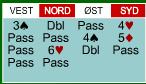 Igjen reiser spørsmålet seg om du og makker har avtalene på plass. Denne gangen har du meldt og makker har støttet og makker har doblet slem. Meldingsforløpet har gått som i diagrammet under, der du er vest: