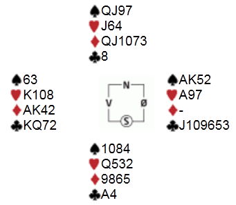 Fikk første stikk for hjerter 10, men luktet 3-3 fordeling i hjerter. Trengte å få stjelet 2 kløver og spilte så kløver Q. Øst gikk opp med A og spilte kløver opp igjen som ble stjålet med spar 4. Hjerter til A og ny kløver til stjeling, men med hva? Syd har igjen K 10 7 5 3 i spar hjerter 6 og ruter 6 3. Nord Har A Q 6 og hjerter K J samt A J 10 x i ruter. Hvis jeg stjeler med spar 6, vil jeg ikke få kommet inn for å ta ut trumfen, hvis den sitter 3-1. Trumfet derfor med spar A, og spilte spar Q og liten. Ingen J, men går man for topp så går man for topp. Fisk med spar 10. Ut med trumf. Hjerter opp og avkast av ruter på 13 hjerter. 12 stikk.