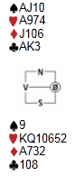 Det var flere artige spill for kvelden, og et spill viste tydelig at engasjementet og bridgeforståelsen også lever godt hos oss glade amatører. Spenningen dirret godt rundt bordet, og høye forventninger datt sammen som et korthus når ulykken var et faktum. Selvsagt var undertegnede byggherre, og da kunne ikke huset stå. Hardmeldt eller ikke, jeg hadde gleden av å sitte i nord som spillefører i 6 hjerter når sparkongen kom ut og følgende kort skulle spilles. Før du blar videre kan jeg røpe at trumfen sitter 3-0 imot med lengden i øst: