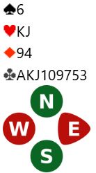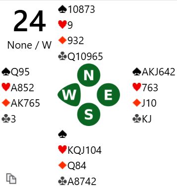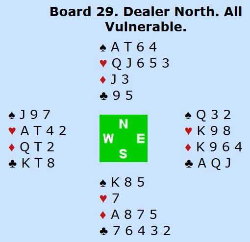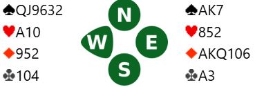 Ø/V har 25 HP til sammen og balanserte hender. Det er normalt å ende i 3NT, men slikt det sitter er det i praksis nokså umulig å vinne den. Om ruteren treffes er man et stykke på vei, men det ser likevel ut som det er langt frem til ni stikk. Alle som bruker 15-17 grand kommer i 3NT hvis nord passer og øst åpner med 1NT. Men om de bruker 13-15NT går det an å si pass på 1NT med vests flate 10-poenger, vel vitende at det er 23 eller 24 poeng til sammen de fleste gangene, kanskje 25 noen ganger,