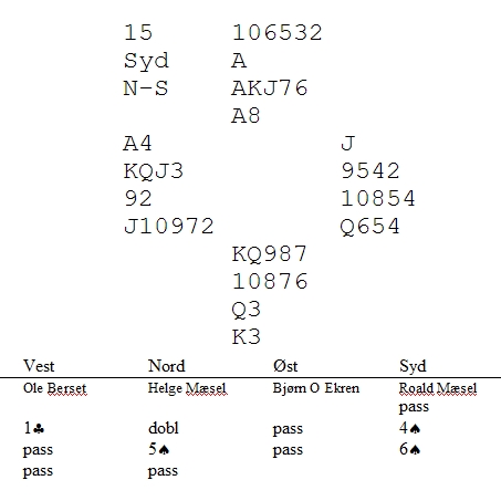 Mange sydspillere klarte ikke å stikke over makkers hjerter knekt andre gangen fargen ble spilt. Da forsvant det en hjerter hos vest på ruterkongen og 4sp føyk hjem. Gi vest en annen fordeling i rødt, f.eks 2-3 og ikke kløverkongen, så er det et stålegg å stikke makkers knekt. Da godspilles tieren til avkast av en ruter.