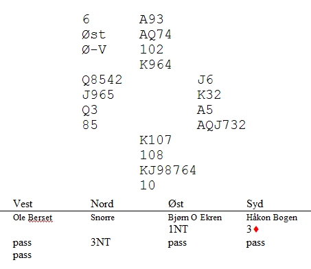 Kopstads hadde løsningen på denne også. Ole i nord spilte ut hjerterdame og hjerter knekt som Kjell Otto stakk over. "Hvordan visste duat det var rett?", spurte jeg. "Jo, vi spiller Runinow, den laveste av to inntilliggende honnører. Når makker avviker fra det, betyr det at han har to honnører dobbel. Enkelt og en beit."