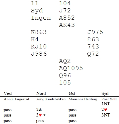 Roar Voll og Asbjørn Kindsbekken hadde en annen fiffig variant. 3hj viser akkurat 2-3 i major og sparen er svak. Da var det lett å melde 3NT for syd. Med spar ut var det minst ti lette stikk.