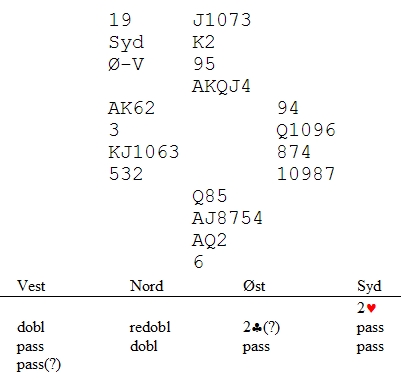 Øst meldte 2kl (!) og to passer fulgte. Nå var det en god venn av Nils som hadde meldt 2kl og det var nesten med vondt i hjertet han doblet. Det kom sikkert ikke til å gå pass rundt.