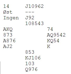 Når det gjelder spillet mot Rune og Tor ville selvsagt Rune spilt perfekt Imot 3 hj , og aldri meldt 4klø slik at vi er strålende fornøyd med -50. Men Snorre du bør se litt nærmere på spillet, så oppdager du sikkert at vim å spille smygmotspill for at Rune skal få mer enn ni stikk i kløverkontrakt!