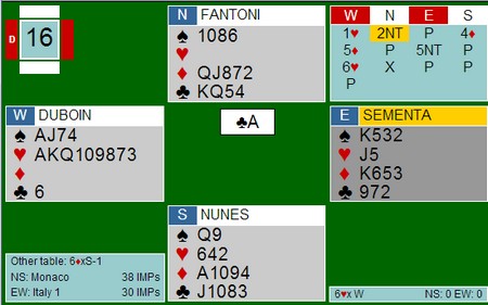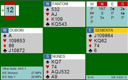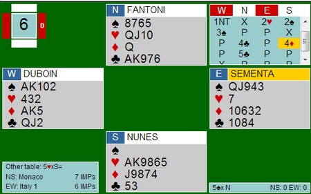 Så et fint meldingsforløp av Fantoni - Nunes. Etter 1NT viser Sementa begge major med 2kl og 2sp fra Nunes i syd viser ruterfarge og gode kort. Nord sin dobling av 4hj ser litt underlig ut med kun dobbel hjerter, men det kan hende de spiller "motsatt" av de vi gjør her hjemme. Dobling viser interesse for at makker skal melde videre, mens pass er nøytralt og/eller viser mer motspillsinteresse.