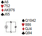 italia meldte lett 6sp på det samme spillet. Legg merke til 4ru som renonsvisende i hjerter. Dette for at åpneren skal ha to muligheter til å si hvor godt renonsen passet. 4sp betyr at "det suger", men 4hj sier at "det er ikke helt galt, men jeg kan ikke gå på til slem alene enda.."