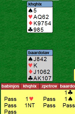 Team Bente Skymoen tapte knapt mot Drøbak. Bente og Tom hadde en fin liste, men litt harde meldinger fra det andre paret medførte et knapt tap. Her var de en håpløs 7 ruter, og en enda mer håpløs 6 NT. Dette er dyrt.
