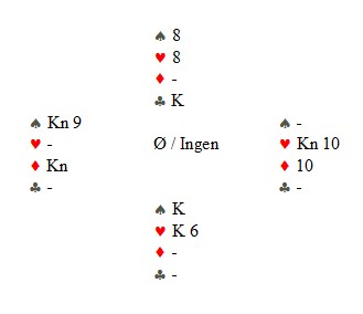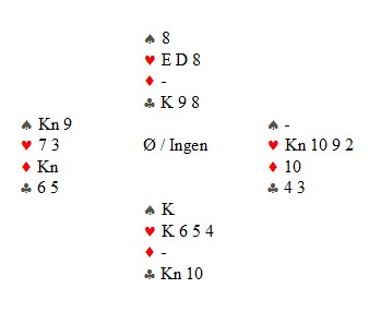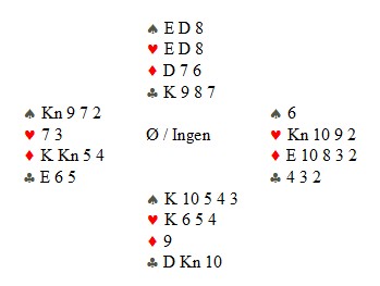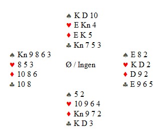 Øst åpner i 1 NT med pass rundt. Utspill Hjerter 10 til liten-liten og damen. Så spar til tier, liten kløver til damen, liten ruter til kongen, og liten ruter fra Thor Dag som spillefører ikke klarte å legge damen på. Resultat tre beit (!) etter en god lasj i utspill og underspilling av ruter E.