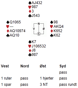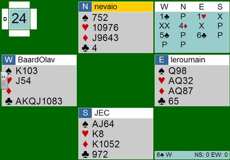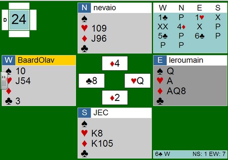 Som dere skjønte i går kveld var det en del tekniske utfordringer for turneringsledelsen, og av en eller annen grunn var poengscoren fra forrige tirsdag doblet for samtlige før vi spilte andre kvelden. Det betyr f.eks. at undertegnede, med beskjedne minus 17p fra forrige tirsdag startet med et utgangspunkt på minus 34 i går kveld. Rimeligvis falt dette heldig ut for Gerd som plutselig hadde 2 x 48 = 96p (!) før hun i det hele tatt hadde talt korta til første spill i går.