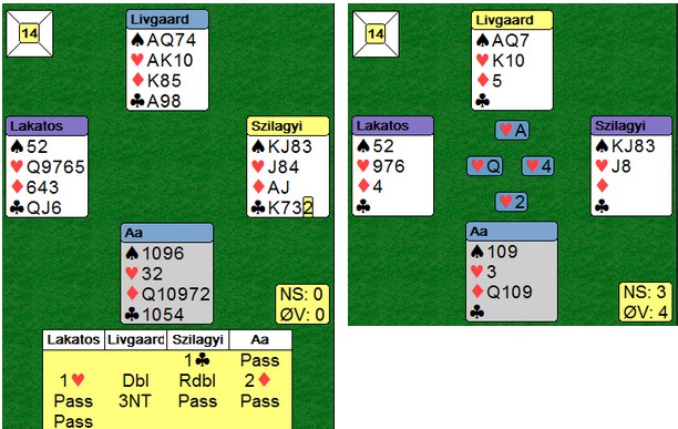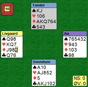 Et svært godt spill på begge bord. 6kl betes vel i praksis med hjerter ut, men på begge bord ble det ruter ut mot 6kl. Odin og Svein Gunnar stakk begge og fant vinnende plan ved å stjele en ruter i stikk to. Tre kløver fra taket ga vunnet slem.