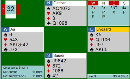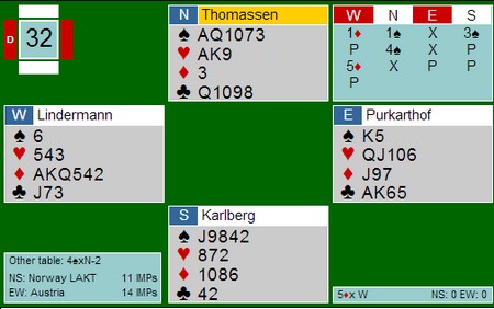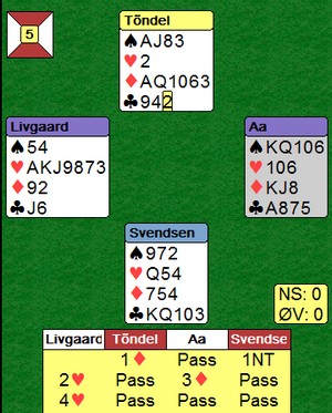 Jan Tore og PIL kom med flotte +650 fra sin kamp, men på det andre bordet meldte Terje Aa inn 2kløver med 6-5. Da kunne de ikke komme i spar lenger og måtte stampe(?) over 5ru i 6kl. Odin straffedoblet, men Petter turde ikke stå med. Han hadde kanskje tro på slem egen vei?