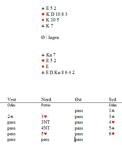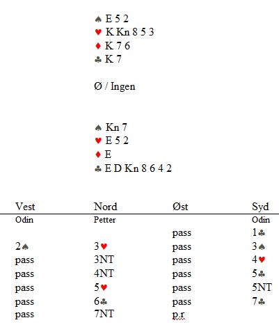 Det er slike avtaler som gjør at man hele tiden får en bedre forståelse av makkeren sine meldinger, samt at alle slike diskusjoner vil tilføre makkerparet en forståelse av hvordan man melder i situasjoner som oppstår hvor man faktisk ikke har avtaler... Det er her man scorer mest, det å ha god kommunikasjon med makkeren sin. Ta feks en hånd som ser slik ut: 4315..... La oss si at denne hånden har 25 honnørpoeng..... De fleste av oss vil kvie seg for å åpner i 1kløver, da vi er redd for pass rundt, åpne i 2/3NT avhengig av hvordan man får vist den poengstyrken med en singleton, det er heller ikke veldig fristende.... Åpne hånda i 2kløver for deretter å melde 3kløver er heller ikke firstende, siden en slik melding normalt viser 6 korts kløver. Så hvordan skal man løse slike hender, dvs hvordan skal man melde slike hender? Løsningen er langt fra noen facitsvar, her finnes det sikkert mange muligheter, men jeg og Ole har feks valgt å løse dette ved å åpne i 2kløver, for deretter å hoppe til 3 i Major for å vise 4 korts Major og 5 korts minor. Da har man i det minste fått på plass en melding som ikke går på bekostning av noe annet inni systemet. Det er selvfølgelig ikke uten å tenke på videre meldingsforløp, for å ha muligheten til å finne ut om 3-1 /1-3 fargene. Vi har heller ikke mistet muligheten til å spørre etter ess, vi har heller ikke gått glipp av å miste 1-6 tilpassen i singleton fargen til åpner, de gangene denne er i minor fargen. 6-1 med single Major hos åpner vil jo aldri være noe problem så sant svarhånda er positiv, da den fargen blir meldt etter 2 kløver åpningen.