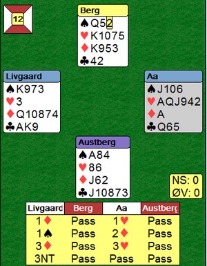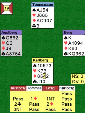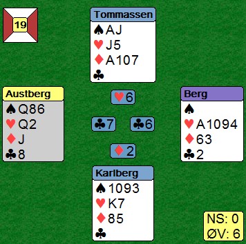 Jan Tore Berg har et vanskelig utspill og starter med spar to til makkers ess som skifta ruter seks. Bordet vant, kløver til esset og hjerter til dame, hjerter ess og mer hjerter.