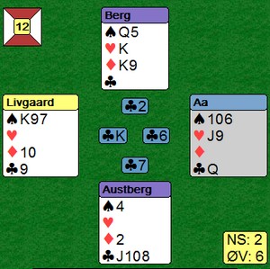 Fargen satt ikke men nord likte seg ikke der han var inne på hjerter ti. Han kunne ikke se hva makker hadde i ruter, så han spilte en liten til makkers knekt og spilleførers dame.