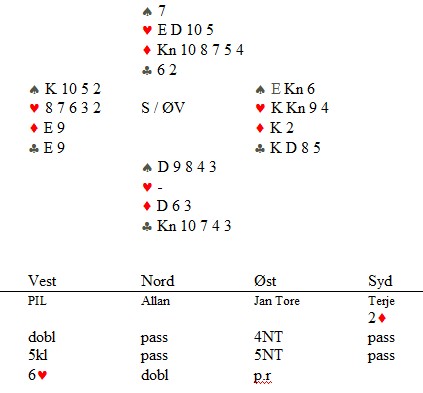 Jeg liker ingen av ØV sine meldinger. Hva Jan Tore mente med 4NT, vet han vel neppe selv. "En balansert sleminvitt?", vil han sikkert si. Det skjønner bare makkere som spiller med seg selv. Nå skulle kanskje 5NT bety "Pick a slam?". Uansett kom de til 6hj og Allan ble grådig i nord.