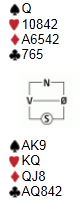 Du må kaste en ruter på kløveresset !. Da er den blokkerende ruteren borte. Uansett hva vest fortsetter med, spiller du deg inn i bordet på ruter og seiler hjerterdamen. Enda en hjerterkapp og to spar forsvinner på ruteren.
