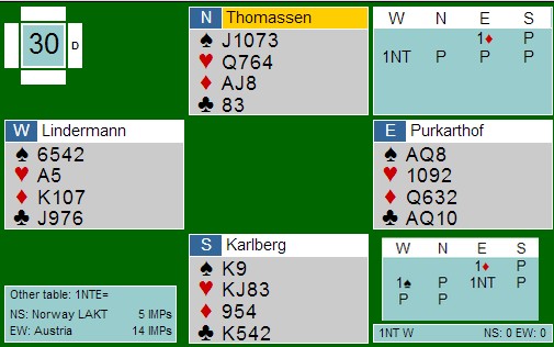 Syd passet også, selvfølgelig, og Vest doblet opplysende ved de fleste bord. Noen Øst-spillere gjorde dette om til straffedobling og tok inn 300.
