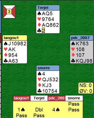 Øst har jo en åpningshånd, men med lengde i motpartens åpningsfarge, er det lite fristende å doble opplysende. Vi har full forståelse for at han sa pass.