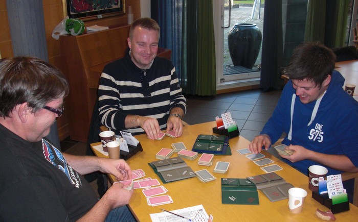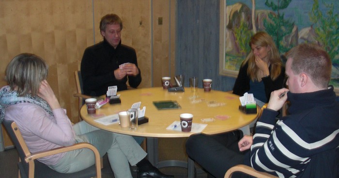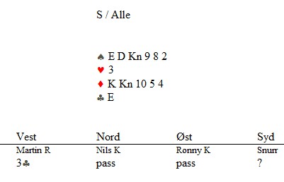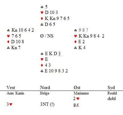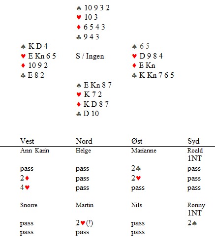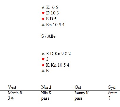 Klarer du denne? Skrevet 15. desember, 2013 av Snorre Aalberg Marianne Harding, Snurr, Ann Karin Fuglestad og Nils 200 Kvangraven Noen ganger handler bridge om å "komme på" rett melding. Jeg klarte det ikke i spillet under, men det gjør sikkert du? Ja, hva blir det til? Du trenger faktisk ikke mer enn EDx(x) i ruter hos makker før det står slem (i verste fall på en sparkapp gjennom han som ikke sperreåpnet), men hvordan kan du finne ut av det? 4ru som "Jumping Michaels" bør være mulig å komme på. Det er krav til utgang med ruter og en major. I verste fall kan en komme i 5ru der en skulle vært i 4sp, men oppsiden er mye større. Under ser du Nils sin hånd og for han er det nå snakk om seks eller syv med de honnørene han har. Martin Reinertsen, Nils Kvangraven og sørlandets største talent, Ronny Kolnes. Legg til kommentar