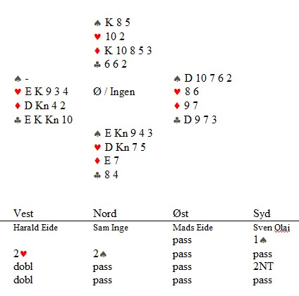 "Eg var redd for at makker hadde 3 korts hjarter og kanskje dårlegare spar slik at det kjem ut E og K i hj, hj til steling. Deretter kjem vest inn i minor og endå ein hj. Difor tok eg ut i 2NT.