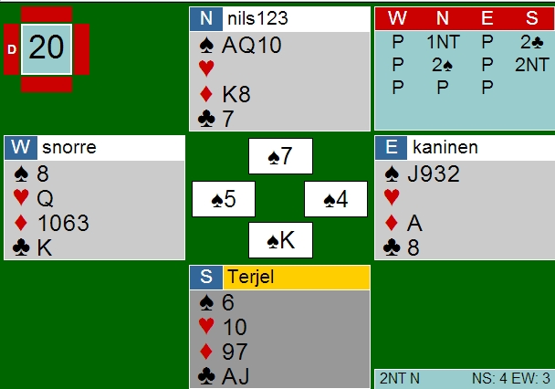 Så ruter til knekt og dame, Geir tok for hjerterknekten og burde kanskje spilt kløver, men spar var ok. Nils hadde ikke forbindelser og stakk med spar kongen i possen under. |
