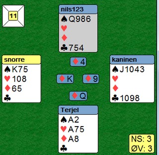 Nils spilte ut sparkongen som jeg lasjerte. Spar damen stakk jeg, la ned kløveresset og spilte ruterkongen til esset. Nå la Terje ruter åtte!!