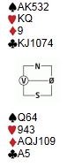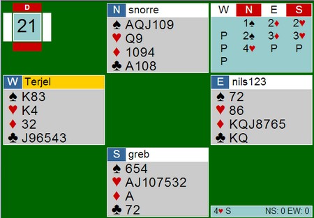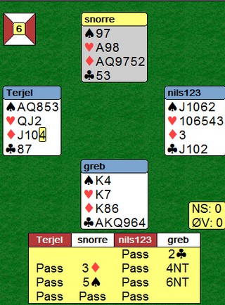 Jan Tore åpnet med 2kl og jeg meldte naturlig 3ru. 3ru viser en fin farge, enten HHxxx eller seks kort. Ulempen var at ruterkontrakt må spilles fra nord og ikke hos han som har honnører å beskytte. Jan Tore var flink og meldte 6NT, men vi hadde nesten fortjent at kløveren satt 4-1.