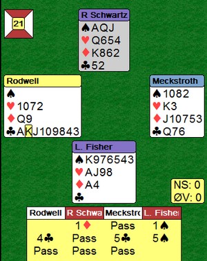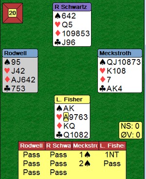 Til høyre viser Lotan Fisher teft når han melder inn en svært så overvektig 1NT. 18hp, fem hjerter og kløverfarge. Når motparten melder 2sp, passer han ut.