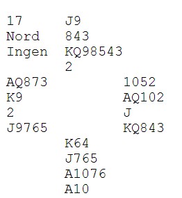 De fleste åpnet med 3ru i nord. Da gikk det pass i øst og 3NT i syd. Vest hadde et rimelig naturlig sparutspill og ni stikk.