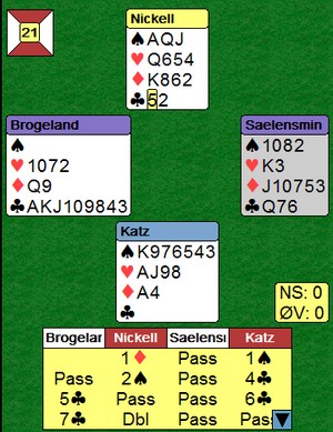 Så til Boye. Han lar motparten finne spartilpassen før han melder kløver. Over 6sp tar han sjefsavgjørelsen og stamper helt på egen hånd. Rett denne gangen, men er ikke dette enmannsbridge, Brogeland? |