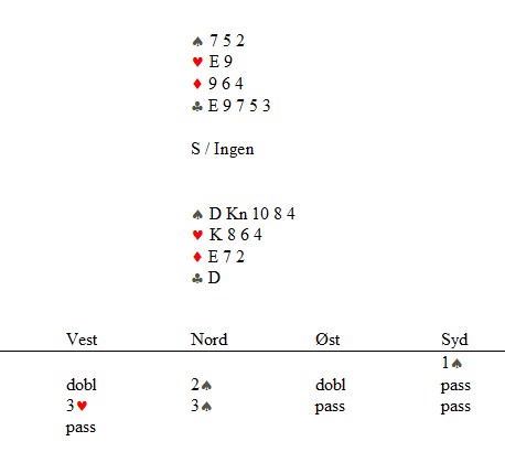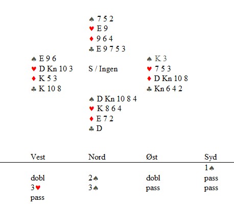 Denne gangen får tdu 3hj på 2NT og vet at makker har 3-4-5-1 fordeling. Det var vel flott?