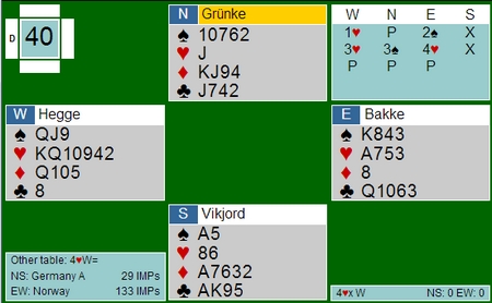Du kan følge spillinga på BBO. I første omgang er det 10 spills Round Robin, alle mot alle, før sluttspillet mellom de fire beste starter på torsdag. Jeg er ikke helt sikker på hvordan semifinalene spilles, men jeg tipper vinneren får velge seg motstand.