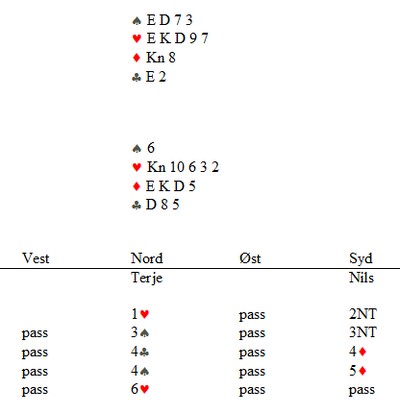 En kort forklaring til meldingsforløpet. 2NT viser hjerterstøtte og krav til utgang. 3sp er naturlig og viser tillegg, mens 3NT fra Nils er en seriøs sleminvitt i hjerter. 4kl, 4ru og 4sp er cuebid, men så kommer Nils med en underlig 5ru. Han vet om kontroll i alle farger og kjempetilpass mot en makker som etter å ha vist tillegg også passerer 4hj.