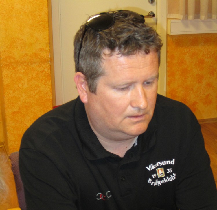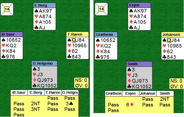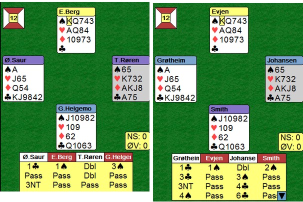Øyvind Saur fikk sparkongen ut til esset. Han fortsatte med ruter til bordet og kløver til kongen (!). Han tenkte sikkert slik at hvis en var kort i kløver, var det sikkert syd som hoppet til 3sp. Nå kunne ikke 3NT vinnes lenger. På det andre bordet la Glenn Grøtheim ned kløveresset tidlig og da spilte resten seg selv. D10xx kunne fanges opp og en hjerter forsvant på ruteren. Hjerteresset satt foran kongen og +920. Den scoren tror jeg ikke mange slår.
