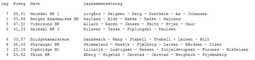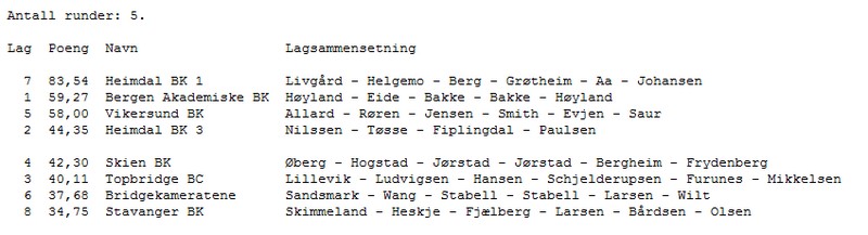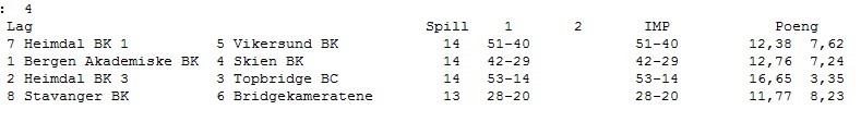 Andre halvrunde starter forsiktig med mange flate spill. I spill 18 levere Allan og Terje et flott motspill mot 3NT og beiter der det blir elleve stikk på det andre bordet. Kampen mellom Heimdal og Vikersund ebber ut uten de store spillene og ender 13.82 - 6.18 til trønderne. BAK ligger på andreplass og de vant nøyaktig med samme sifre.