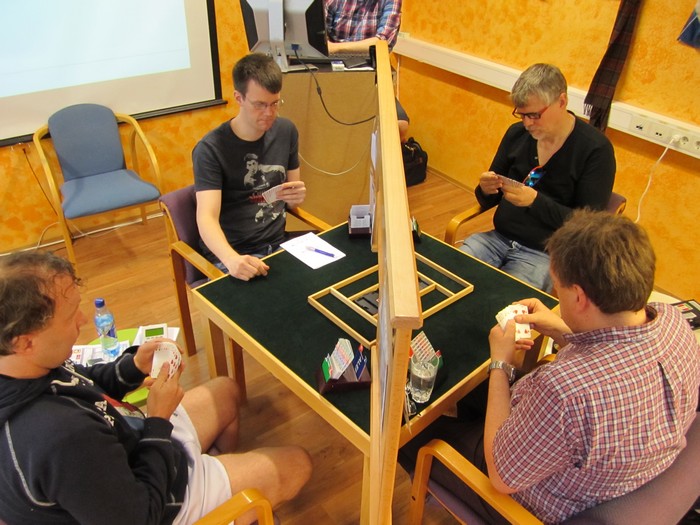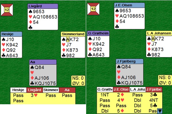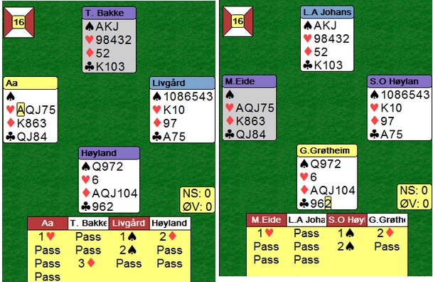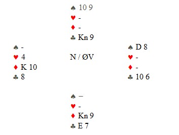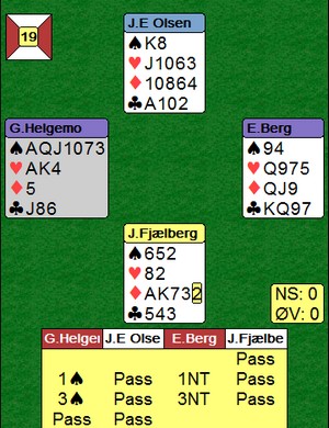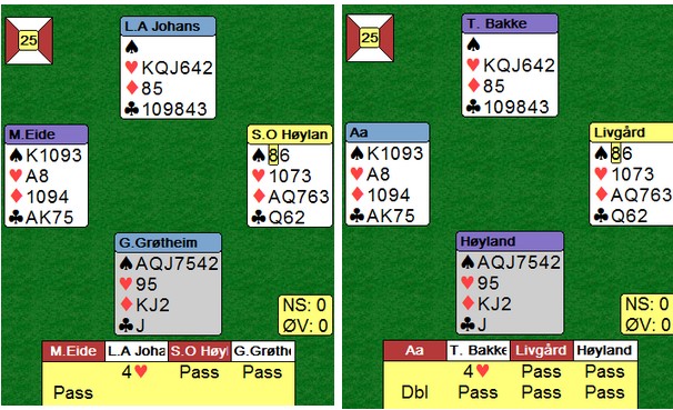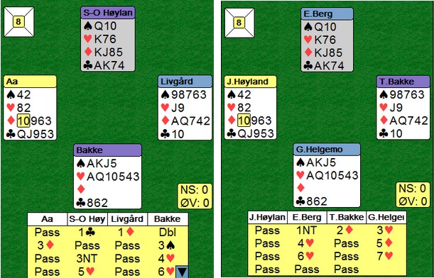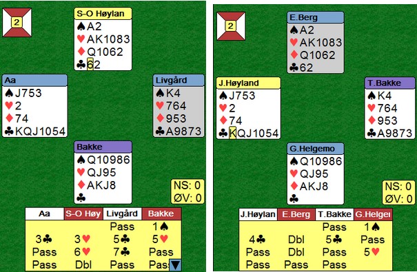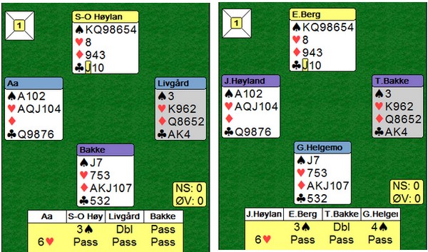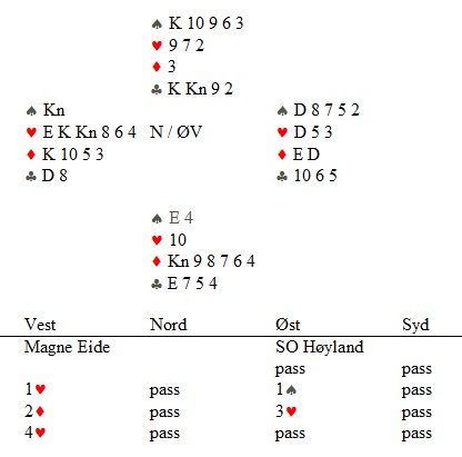 Trond Bårdsen spilte ut kløver fem til esset. Mer kløver til kapp, ruter til esset og spar til damen. Hjerter knekt seilte rundt til øst som godspilte kløveren. Glenn fant ruteren ved å spille til damen og kappe på tieren før hjerter til nieren sikra det niende stikket.