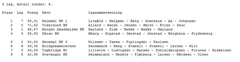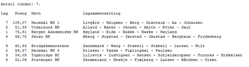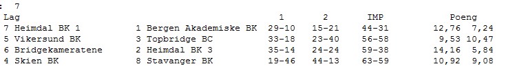 Arrangøren ønsket at alle lagene fikk minst en kamp på BBO. Fram til nå var det kun Stavanger som ikke har vært på TV, så da sendte de kampen Heimdal 1 - Stavanger. Heimdal ledet med flere mil på neste lag, så kampen var ikke spennende med tanke på sluttresultatet. Vinnerne har vært mye på BBO, men jeg synes ikke denne kampen var den beste de har spilt. For en gang skyld kunne vi se at Geir Helgemo gikk beit i en 3NT der det andre bordet fikk elleve stikk, uten at det nødvendigvis betyr at den ene spilte så mye mer riktig enn den andre.