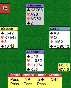 Her synes jeg Glenn Grøtheim virkelig grov dypt i meldeboksen, men han likte kortene sine selv om de innholdt bare 10 honnørpoeng. Å doble for å vise hjerter, var ikke aktuelt. Skulle han spille utgang, virka det som 3NT var nærmest.