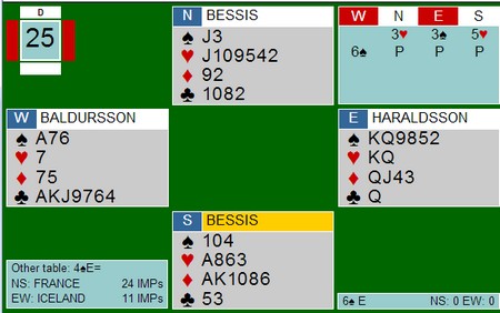 Noen sa det ville blitt verre om Erik Berg hadde spilt mer spar i stikk to, men det stemmer ikke. Bordet stjeler og spiller ruter 9. Den må Øst dekke, hvis ikke er man kjapt i samme posisjon som over. Øst bruker derfor kongen eller knekten, men Syd vinner og spiller kløver til esset. Så ruter 8. Dekker Øst, har bordet inntak til å stjele en kkløver og spille seg fra til posisjonen over. Dekker ikke Øst ruter 8, får den beholde stikket og en kløver stjeles. Nok en gang er det mulig å spille seg fr til posisjonen over.