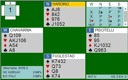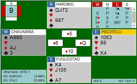 Erik Berg starta med spar ess og skifta til kløver. Esset vant stikk og så seilte ruter 9 rundt (!) Nord hadde vist blakk i ruter med sin 4 ru, så det var sikkert ikke noen kunst for stjørdalingen. Kløver til stjeling, og kongen kom på. Spar til røff og ruter til damen. Så alle ruterne unntatt den siste. Posisjonen var ( se diagram over )
