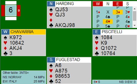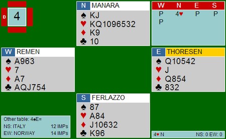 Saur stakk kløverskiftet med esset og trakk ruter 9, Helgemo la liten, men Saur la også liten ettersom Vests 4 ruter indikerte renons i ruter. Nå fulgte en kløverstjeling ( kongen falt ) en sparstjeling og ny ruterfinesse. Ruter ess tok ut trumfen, og etter ytterligere noen ruterrunder var dette stillingen: