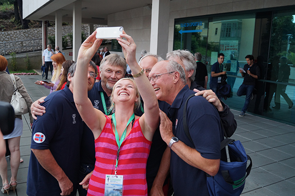 Danske Christina Lund Madsen som er reporter for EBL ville ta en "selfie" med seniorherrene!