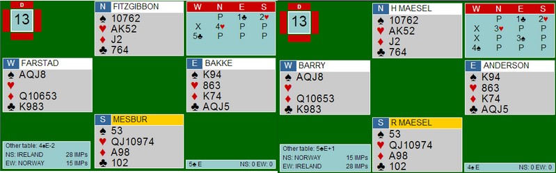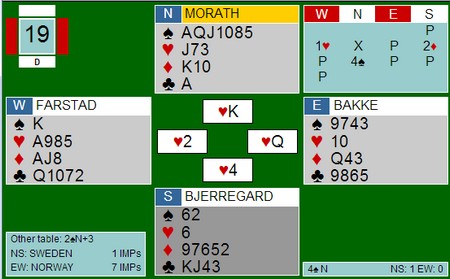 På det andre bordet melder Monaco 7 kløver slik at kampen ender med 6 imps seier til Norge. Uansett veldig bra å snu dette etter å ligge 16-0 under etter 2 spill.