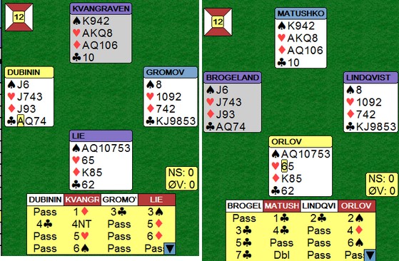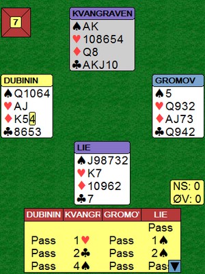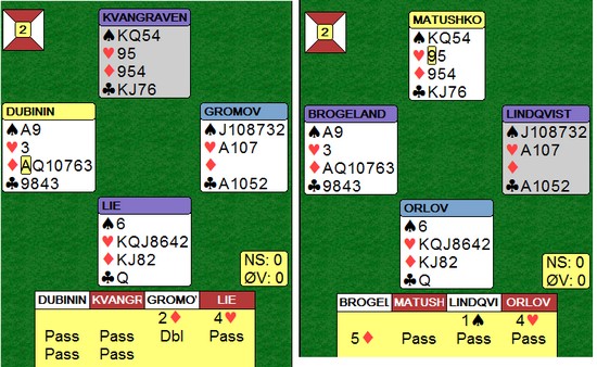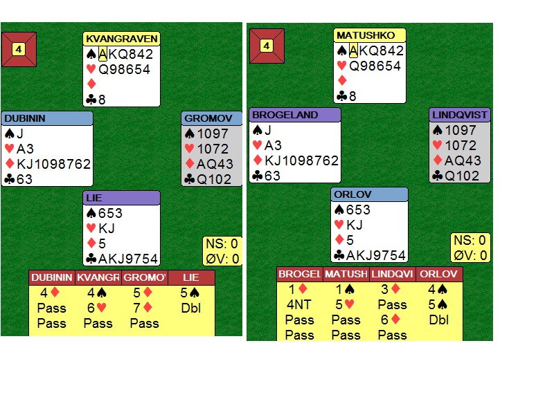 Russeren var heldigvis dårligere (?) enn Terje Lie, så Orlov gikk inn på sparesset og spilte på hjerteren (!) i 3NT. Der er en avhengig av kappen pluss 3-3 sits. I ruter mangler det bare at tieren ikke gir stikk. En heldig utgangssving til Norge siden Boye og Espen fikk tre i kløver, hjerter 9 og ruteresset