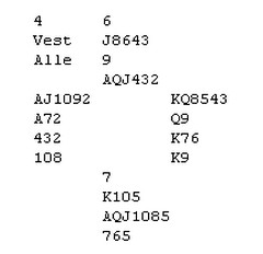 I spill 4 åpner makker i vest med 2sp (8-11hp og 5-kortsfarge). Med 11-kortstilpass(!) i spar tenker nok mange at her skal vi spille sparkontrakt på et eller annet nivå. Jeg tenker som så at til tross for en 6-kortsfarge så har jeg en helt flat hånd, slik at vi neppe får utnyttet all trumfen. Videre har jeg noenlunde hold i alle farger og 6 raske spar-stikk. Siden makker har minst 3hp utenom sparen så sjanset jeg på 3NT. Det er godt mulig 3NT ikke står, men da er etter alle solemerker 4sp beit også.