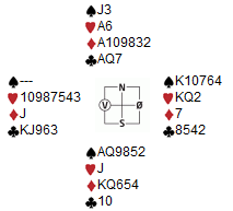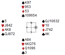 Utspill er ruQ som jeg er nødt til å stikke, siden jeg ikke tåler kløvervri. På fire runder spar så klarer jeg først gi motparten bakoversveis (ingen spar makker!!?), for deretter å få plassert klA i nord og hjK i sør. Dermed kl mot kongen, og når ruteren heldigvis ikke satt 5-2 så kunne jeg notere 9 stikk og hjemgang.