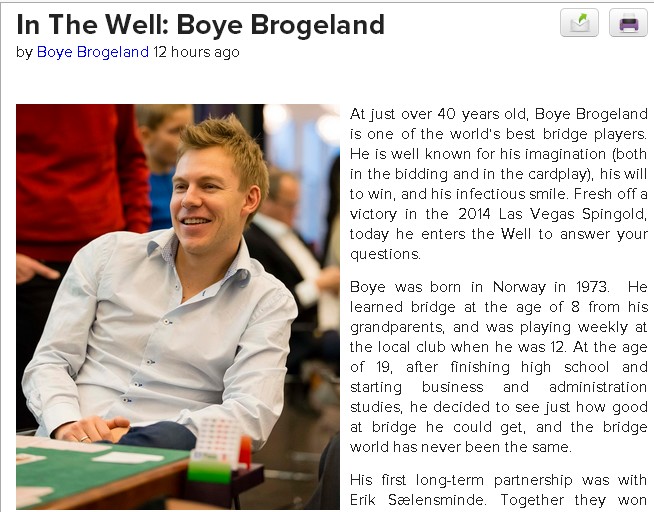 Helge i Nord åpnet med 1 kløver (min to), dobbel fra Øst og 1 spar fra meg. Bjerregård meldte to hjerter og Helge hoppet til tre spar. Øst hadde ei kjempehånd når makker kunne melde hjerter og meldte 4 spar. Jeg satt på samme side som Bjerregård og han lurte på hvor mange spar jeg hadde vist. 4 svarte jeg. Etter en kort vurdering, kom den grønne passlappen frem. Heldigvis unnlot Helge å doble og med spar ut ble det 5 bet å notere.