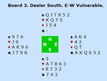 Bjerregård åpnet med 1 kløver og nå gjorde Helge det svært vanskelig for svenskene ved å melde to ruter. Morath i Øst doblet opplysende og Bjerregård meldte sin laveste majorfarge. To hjerter ble passet ut og to sonebet til de kjekke sørlendingene.
