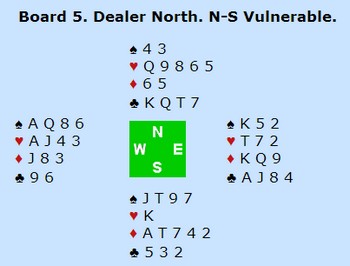 Jeg åpnet noe heldig med en ruter og dermed fant ikke Vest noen bedre melding enn pass. Helge i Nord svarte 1 hjerter og Øst meldte 1 grand. Jeg sa pass og nå tok Bjerregård en lang tenkepause.